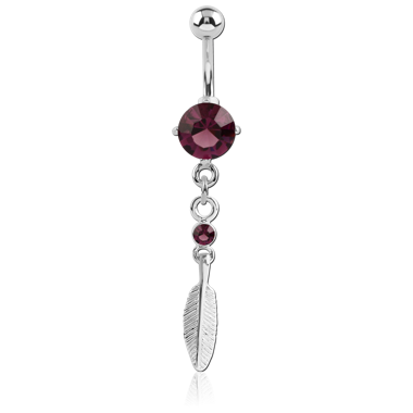 RHODIUM PLATED BRASS JEWELED NAVEL BANANA WITH DANGLING CHARM - FEATHER